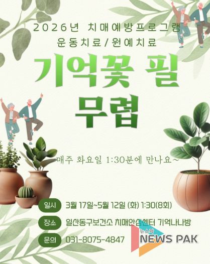뉴스팍 배상미 기자 | 고양특례시 일산동구보건소 치매안심센터는 지역 어르신들의 인지기능 향상과 정서적 안정을 위해 원예활동과 신체활동을 결합한 치매예방 프로그램 ‘기억꽃 필 무렵’ 참가자를 모집한다.