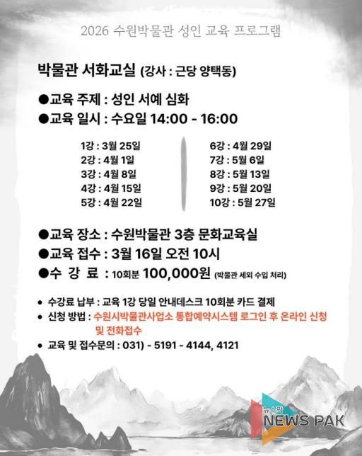 뉴스팍 배상미 기자 | 수원박물관이 2026년 상반기 성인 교육 프로그램에 참여할 수강생을 16일 오전 10시부터 모집한다.