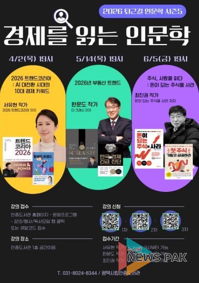 첫 번째 강연은 4월 2일 오후 7시, 안중도서관 1층 공간이음에서 ‘2026 트렌드코리아’ 공저자인 서유현 작가를 초청해 ‘2026 트렌드코리아: AI 대전환 시대의 10대 경제 키워드’를 주제로 강의를 진행한다. 두 번째 강연은 5월 14일 오후 7시, 한문도 작가가 ‘2026년 부동산 트렌드’를 주제로 강연하며, 세 번째 강연은 6월 5일 오후 7시, 최진권 작가의 ‘주식, 사람을 읽다: 돈이 되는 주식을 사라’를 주제로 시민들과 만날 예정이다.