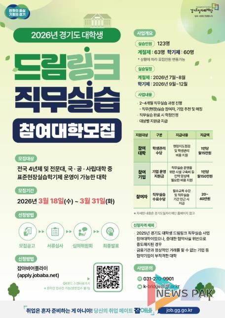 뉴스팍 배상미 기자 | 경기도와 경기도일자리재단이 ‘경기도 대학생 드림링크 직무실습’ 사업에 참여할 15개 협력대학을 31일까지 모집한다.