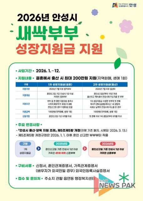 뉴스팍 배상미 기자 | 안성시는 3월 13일'안성시 출산·양육 지원 조례'일부개정을 통해 새싹부부성장지원금 연령 기준(49세이하 신혼부부)을 폐지하여 지원 대상을 확대했다.
