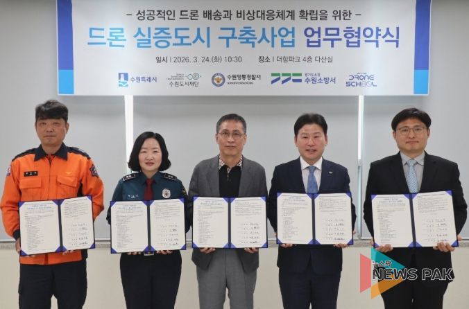 뉴스팍 배상미 기자 | 수원특례시, 수원도시재단, 수원영통경찰서, 수원소방서, ㈜드론스쿨인터네셔널은 24일 더함파크에서 ‘드론 실증도시 구축 사업’ 추진을 위한 업무협약을 체결하고, 협력을 약속했다.