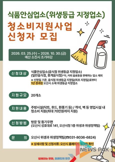 뉴스팍 이소율 기자 | 오산시는 음식점 위생 수준 향상과 안전한 외식환경 조성을 위해 식품안심업소 20개소를 대상으로 최대 70만원의 청소비를 지원한다고 밝혔다.