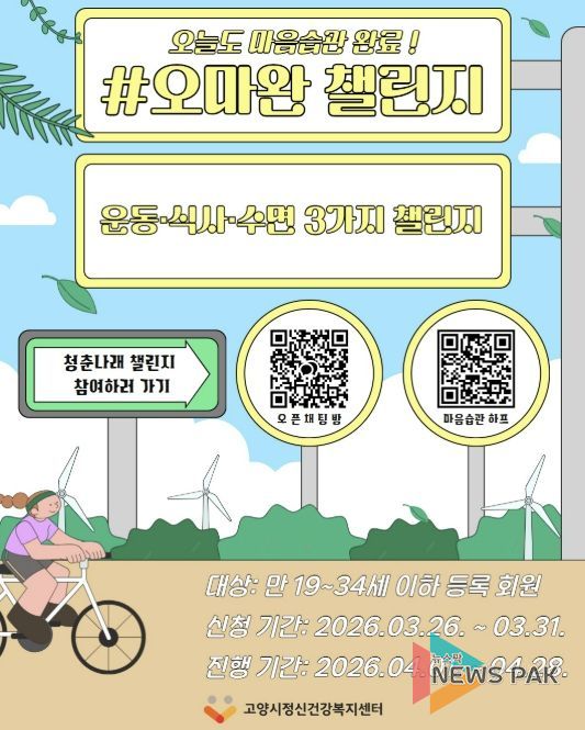 뉴스팍 배상미 기자 | 고양시정신건강복지센터는 청년들의 건강한 생활습관 형성을 지원하기 위해 온라인 집단 프로그램 ‘#오마완(오늘도 마음습관 완료) 챌린지’를 오는 31일까지 참여자를 모집한다.
