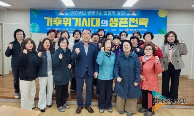뉴스팍 배상미 기자 | 광명시 광명3동 주민자치회(회장 민병돈)는 기후위기 시대에 대응하는 시민 의식을 확산하기 위해 지난 26일부터 27일까지 이틀간 ‘기후위기 시대의 생존전략’ 인문학 특강을 개최했다.