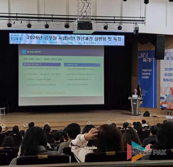 뉴스팍 류은정 기자 | 화성특례시는 27일 시청 대강당에서 공공부문 AI 행정 혁신을 선도할 핵심 인재 양성을 위해 ‘공무원 AI 챔피언 교육과정 설명회’를 열었다. 이번 설명회는 공무원들이 AI와 데이터를 활용해 실제 행정 문제를 해결하는 ‘AI 챔피언’으로 거듭나 조직 전반의 업무 처리 방식을 혁신하고자 마련됐다.