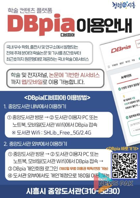 뉴스팍 배상미 기자 | 시흥시중앙도서관은 시민들의 연구·학습 활동을 적극 지원하고 지식정보 접근성을 높이기 위해 국내 대표 학술 콘텐츠 플랫폼인 ‘디비피아(DBpia)’ 이용 서비스를 지난 3월 27일부터 시작했다.