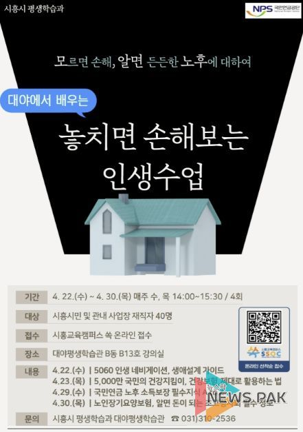 프로그램은 총 4회 과정으로, 시흥시민과 관내 사업장 재직자 40명을 대상으로 진행된다. 주요 내용은 ▲5060 인생 네비게이션, 생애설계 가이드(4월 22일) ▲건강보험 제대로 활용하는 법(4월 23일) ▲국민연금 노후 소득보장 필수지식(4월 29일) ▲노인장기요양보험 활용 정보(4월 30일) 등으로 구성돼, 중장년층의 안정적인 노후 준비를 위한 필수 정보를 제공한다.