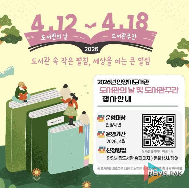 뉴스팍 배상미 기자 | 안양시 관내 10개 공공도서관이 제4회 ‘도서관의 날’과 제62회 ‘도서관 주간’을 맞아 ‘도서관 속 작은 펼침, 세상을 여는 큰 열림’이라는 주제로 다채로운 독서문화행사를 개최한다.