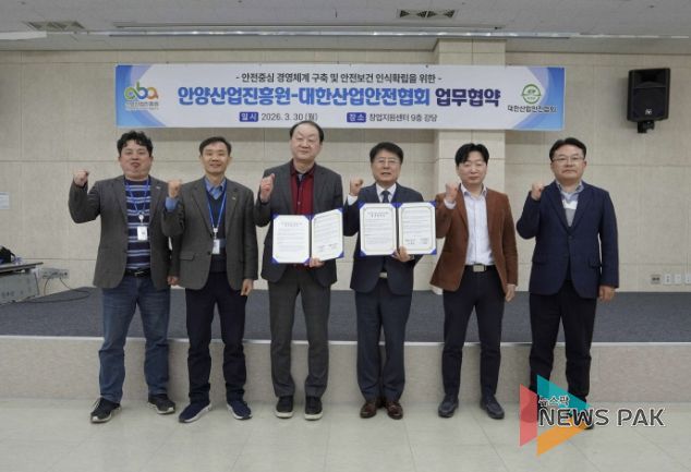 뉴스팍 배상미 기자 | 안양산업진흥원은 지난 30일 안양 창업지원센터 9층 강당에서 대한산업안전협회와 산업안전 및 안전보건 인식 확립을 위한 업무협약을 체결했다고 31일 밝혔다.