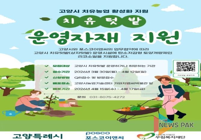 뉴스팍 배상미 기자 | 고양특례시는 시민의 정서 안정과 건강 증진을 위한 '치유텃밭 운영자재 지원사업' 참여기관을 4월 12일까지 모집한다.
