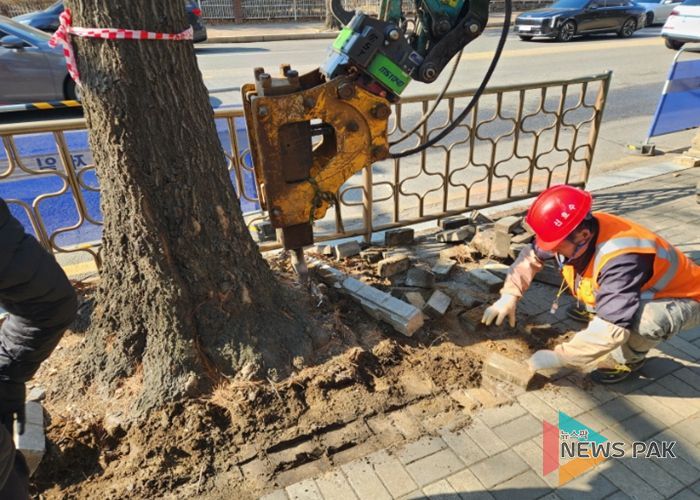 정비 작업은 보도블록을 걷어내고 돌출된 뿌리를 정비한 뒤 보도블록을 평탄하게 재설치하는 방식으로 진행되며, 이번 공사에는 밀려난 도로경계석을 제자리에 설치하는 작업도 포함됐다.