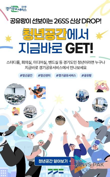 뉴스팍 배상미 기자 | 경기도 내 공공시설과 공공 자원을 온라인으로 예약할 수 있는 경기도 통합예약 시스템 ‘경기공유서비스’가 시군 청년센터 공간을 한 곳에서 신청할 수 있는 ‘청년공간’ 예약서비스를 1일부터 제공한다.