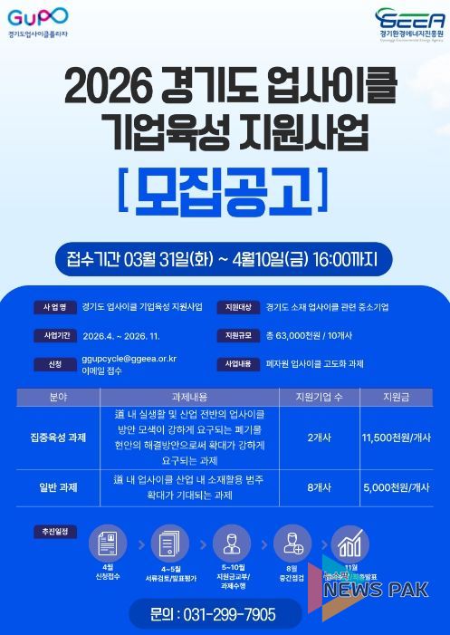 뉴스팍 배상미 기자 | 경기환경에너지진흥원이 업사이클 기업을 발굴해 기술 고도화와 사업화를 돕는 ‘경기도 업사이클 기업육성 지원사업’ 참여기업을 10일까지 모집한다.