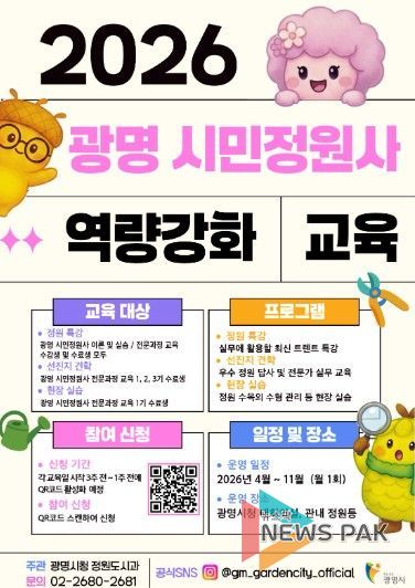 신은철 정원도시과장은 “시민정원사는 정원도시 광명 미래를 일구는 핵심 동력”이라며 “이번 교육으로 시민들이 전문가 역량을 현장에서 마음껏 펼칠 수 있도록 실무 중심 지원을 강화하고, 광명시 전역에 고품격 정원문화를 뿌리내리겠다”고 밝혔다.