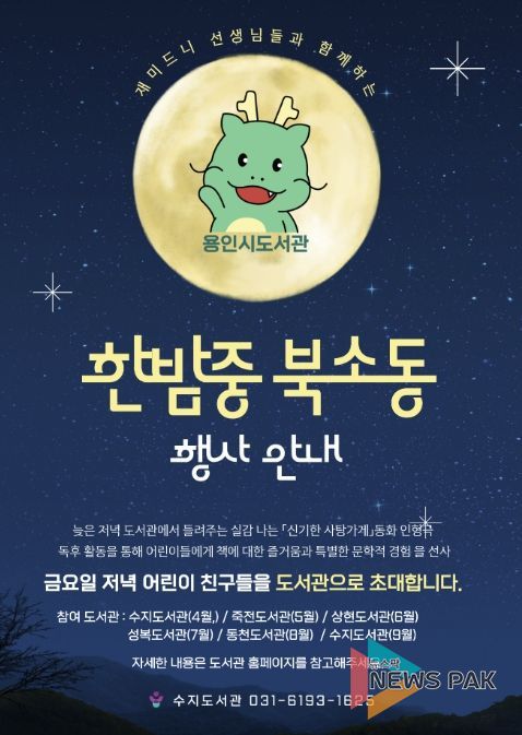뉴스팍 배상미 기자 | 용인특례시 서부도서관은 수지‧죽전‧상현‧성복‧동천도서관에서 야간 독서문화 프로그램 ‘한밤중 북소동’을 운영한다고 25일 밝혔다.