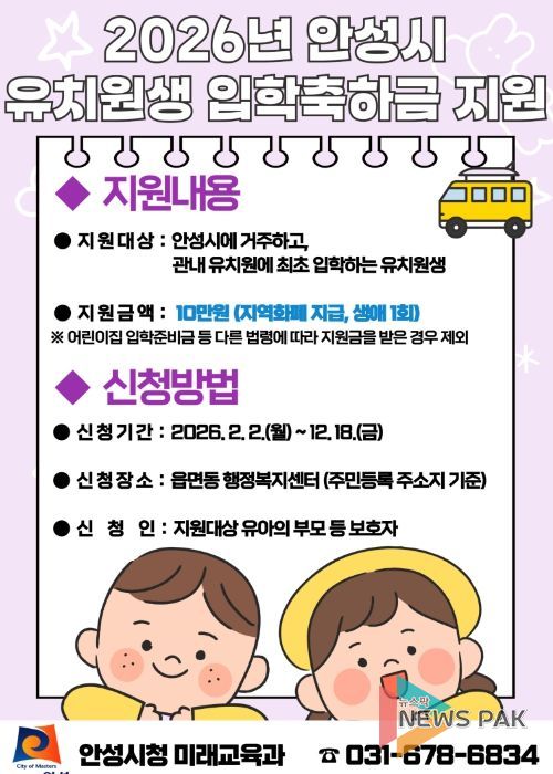 뉴스팍 배상미 기자 | 안성시는 안성에서 성장하고 있는 유아의 유치원 입학을 축하하고 학부모의 양육비 부담을 완화하기 위해 ‘2026년 유치원생 입학 축하금을 지원사업’을 시행한다고 밝혔다.