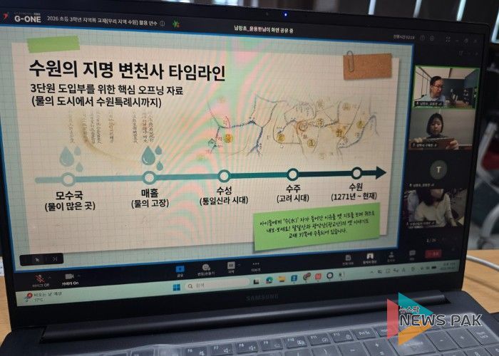 뉴스팍 배상미 기자 | 경기도수원교육지원청은 4월 2일 관내 초등 3학년 담임교사를 대상으로 '2026 초등 3학년 지역화 교재(우리 지역 수원) 활용 연수'를 온라인으로 실시했다.