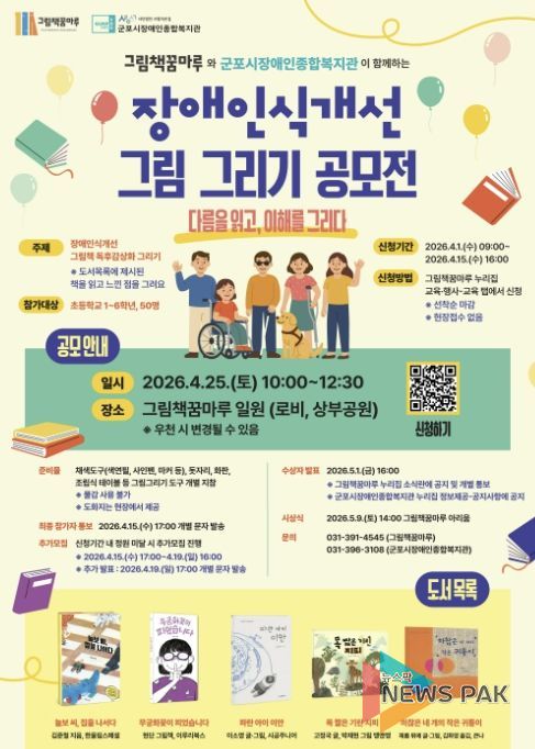뉴스팍 배상미 기자 | 군포 그림책꿈마루와 군포시장애인종합복지관이 공동 주관하는 장애인식 개선 그림그리기 공모전이 오는 4월 25일(토) 10시부터 그림책꿈마루 로비 및 상부공원에서 진행될 예정이다.