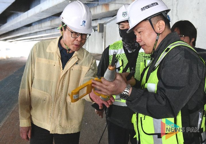 이번 정밀안전진단은 지난 3월 16일부터 오는 6월 3일까지 진행되며, 육안조사와 비파괴시험 등을 통해 교량의 구조적 안전성을 종합적으로 점검하고 있다. 특히 균열, 백태 등 외관 상태를 면밀히 조사하고, 고소작업차를 활용한 근접 외관 조사와 상부구조물 탄성시험 등을 통해 눈에 보이지 않는 미세 손상까지 확인하고 있다.