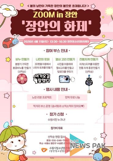 뉴스팍 배상미 기자 | 수원시청소년청년재단 장안청소년청년센터는 오는 4월 11일, 봄의 낭만을 가득 담은 프로그램 ZOOM IN 장안 ‘장안의 화제’를 개최한다고 밝혔다.
