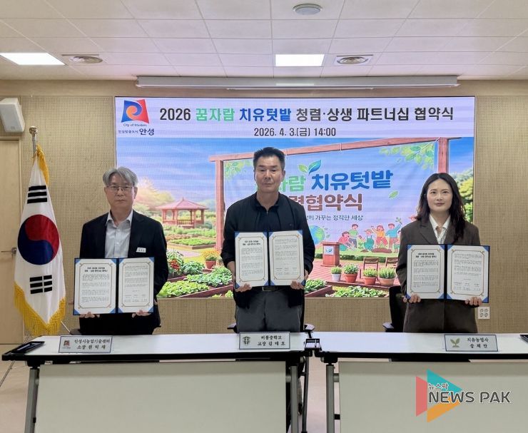 뉴스팍 배상미 기자 | 안성시 농업기술센터는 지난 4월 3일 센터 내 생활과학관에서 비룡중학교 및 대표 치유농업사와 함께 '2026 꿈자람 치유텃밭 청렴·상생 파트너십 협약'을 체결했다.