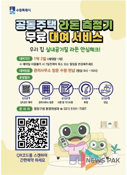 뉴스팍 배상미 기자 | 수원시 팔달구는 이번 4월부터 관내 공동주택을 대상으로 ‘라돈측정기 공유서비스’를 본격 추진한다.