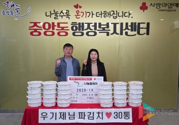 뉴스팍 이소율 기자 | 오산시 중앙동행정복지센터는 지난 6일 우기제 지역사회보장협의체 전(前) 위원장이 지역 내 어려운 이웃들을 위해 직접 담근 파김치 30통을 기탁했다고 밝혔다.