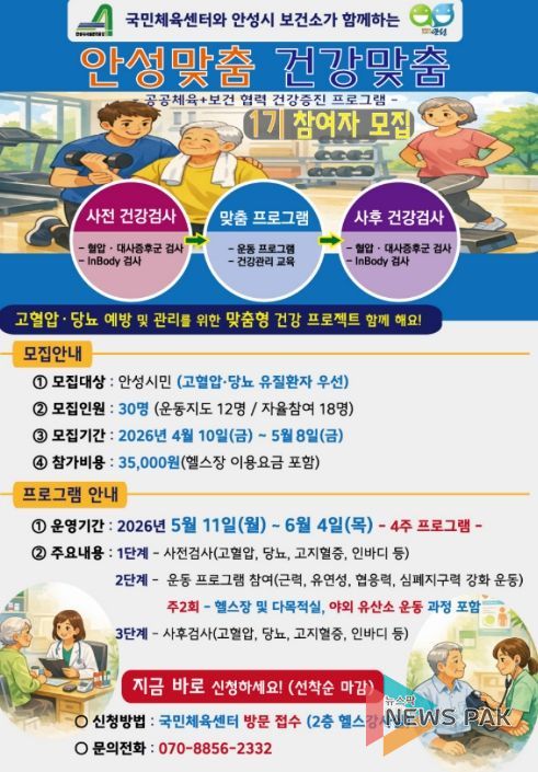 뉴스팍 배상미 기자 | 안성시시설관리공단 국민체육센터는 안성시 보건소와 협력하여 안성시민 건강증진을 위한 '안성맞춤 건강맞춤' 프로그램 참여자 30명을 모집한다고 밝혔다.