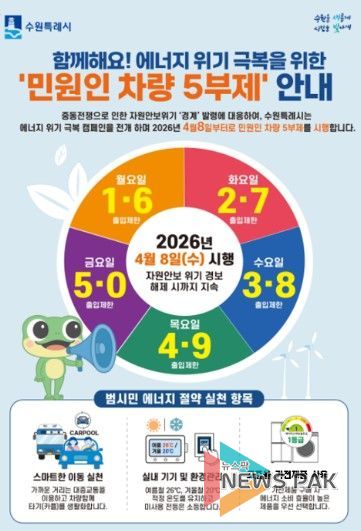 수원시 관계자는 “국가적 자원안보 위기 속에서 에너지를 절약하고, 교통 수요를 관리하기 위해 공영주차장 5부제를 추진한다”며 “시민 여러분께서 적극적으로 동참해 주시길 바란다”고 당부했다.