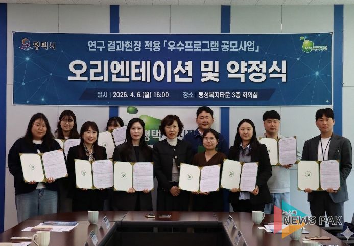 뉴스팍 이소율 기자 | 평택복지재단은 2026년 4월 6일 팽성복지타운 3층 회의실에서 2026년 평택복지재단 연구결과 현장적용 '우수프로그램 공모사업' 최종선정기관 10개소를 대상으로 오리엔테이션 및 약정식을 진행했다. 이번 행사는 공모사업 수행에 필요한 주요 지침과 행정사항을 공유하고, 재단과 수행기관 간 약정 체결을 통해 사업의 책임성과 공신력을 높이기 위해 마련됐다.