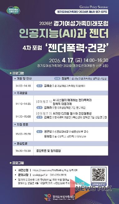 뉴스팍 배상미 기자 | 경기도여성가족재단은 오는 17일 재단 회의실에서 ‘인공지능과 젠더폭력·건강’을 주제로 4차 경기여성가족미래포럼을 개최한다. 3월부터 5월까지 총 5차례 진행하는 경기여성가족미래포럼 중 이번이 4회차다.