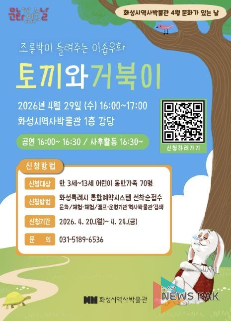 뉴스팍 류은정 기자 | 화성특례시 역사박물관은 오는 4월 29일 ‘문화가 있는 날’을 맞아 어린이와 가족을 위한 체험형 공연 프로그램을 운영한다.