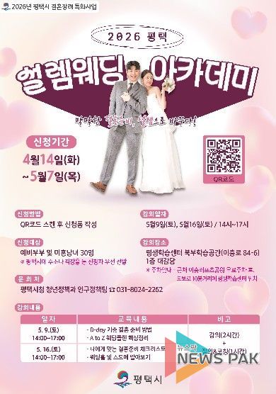 뉴스팍 이소율 기자 | 평택시는 2026년 평택시 결혼 장려 특화사업 ‘2026 평택 설렘웨딩 아카데미’를 오는 5월 9일과 16일에 운영한다고 밝혔다.