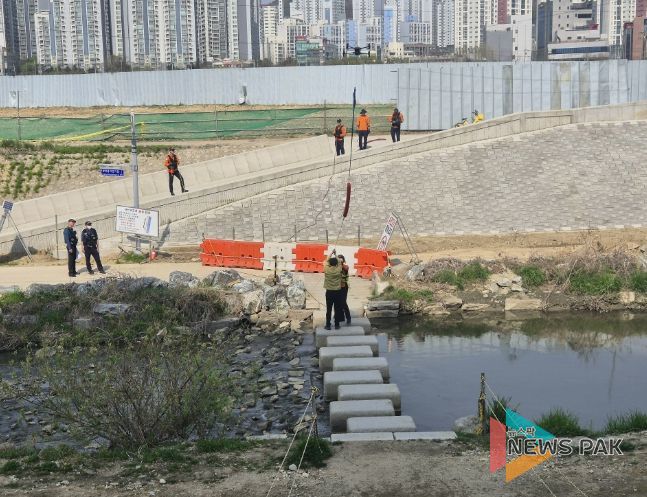 뉴스팍 배상미 기자 | 군포시는 4월 13일 안양천 일원에서 시간당 100mm 이상의 극한강우 상황을 가정한 재난 대응 및 복구 훈련을 실시했다.
