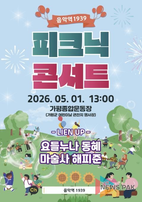 가평군은 오는 5월 1일 오후 1시 가평종합운동장에서 ‘피크닉 콘서트’를 개최한다고 밝혔다. 이번 공연은 ‘제15회 가평군 어린이날 큰잔치’의 축제 분위기를 조성하고, 주민들에게 야외 휴식 공간에서 즐기는 문화 향유 기회를 제공하기 위해 기획됐다.