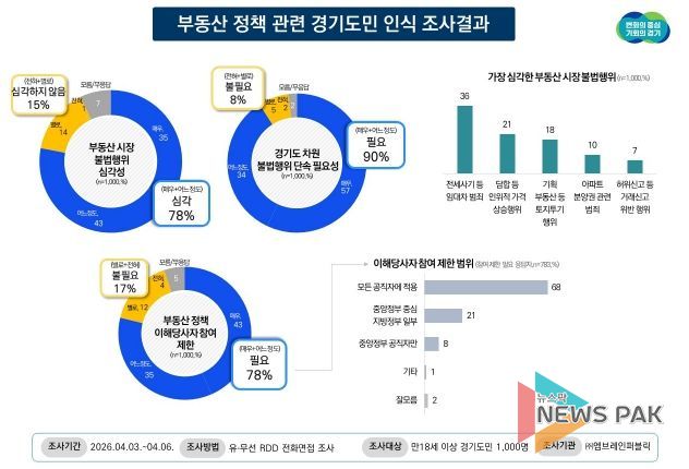 뉴스팍 배상미 기자 | 경기도민의 78%는 현재 부동산 시장의 불법행위를 심각하게 인식하고 있으며 경기도 차원의 단속 강화 필요성에는 90% 도민이 공감한다는 조사결과가 나왔다.