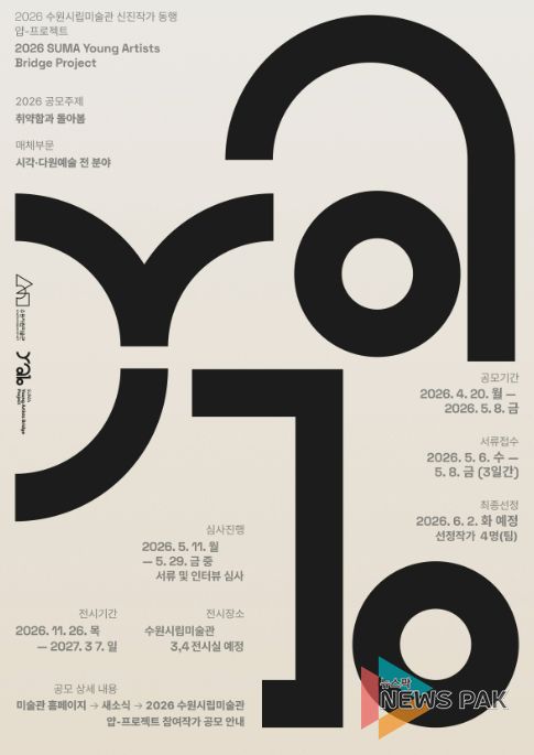 뉴스팍 배상미 기자 | 경기도 수원시립미술관은 신진작가 발굴 및 창작 지원을 위한 공모 사업‘신진작가 동행 얍-프로젝트(YAB-Project)’를 개최하고 4월 20일부터 5월 8일까지 참여자 모집 공고를 시작한다. 서류 접수는 5월 6일부터 5월 8일 오후 6시까지 이메일을 통해 진행된다.