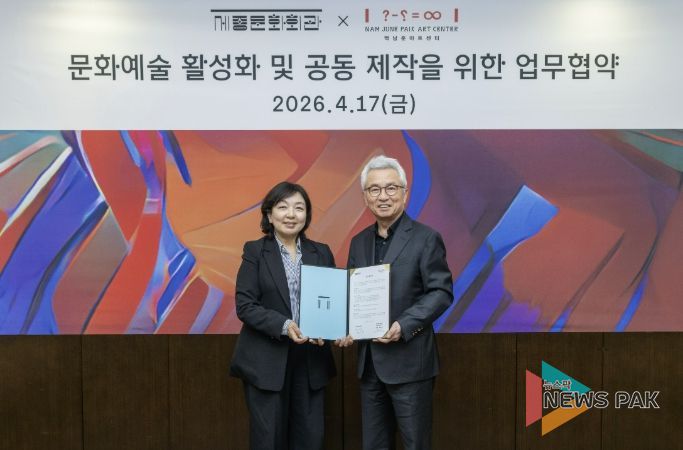 뉴스팍 배상미 기자 | 경기문화재단 백남준아트센터와 재단법인 세종문화회관은 4월 17일, 동시대 예술의 담론 확장과 지속가능한 창작 생태계 조성을 위한 업무협약(MOU)을 체결했다. 이번 협약은 양 기관의 상호존중과 신뢰를 바탕으로, 서울과 경기 지역을 연결하는 광역 문화권 공동제작 모델을 구축하기 위한 협력의 출발점으로 마련됐다.