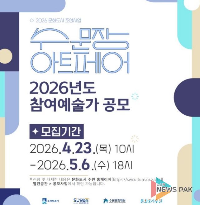 뉴스팍 배상미 기자 | 수원문화재단은 지역 예술가의 작품 판로 확대와 지속가능한 창작 활동 기반 마련을 위해 2026년 ‘수문장 아트페어’ 참여 예술가를 모집한다.