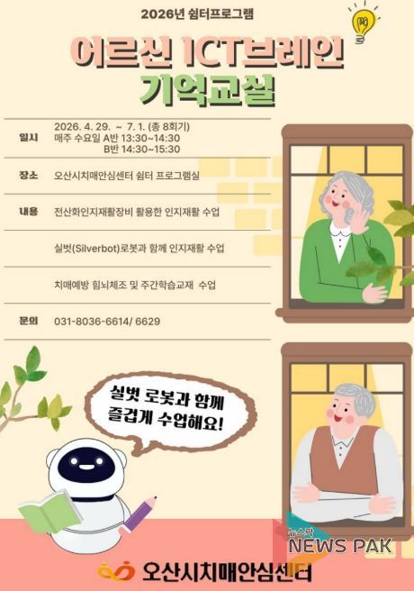 뉴스팍 이소율 기자 | 오산시치매안심센터는 오는 4월 29일부터 경증 치매환자를 위한 쉼터 프로그램 ‘ICT 브레인 기억 교실’을 운영한다고 밝혔다.