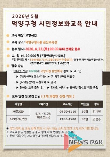 교육은 5월 4일부터 28일까지 덕양구청 전산교육장에서 진행되며, 수강 신청은 4월 23일 오전 9시부터 덕양구청 통합예약 누리집을 통해 온라인으로 접수할 수 있다.