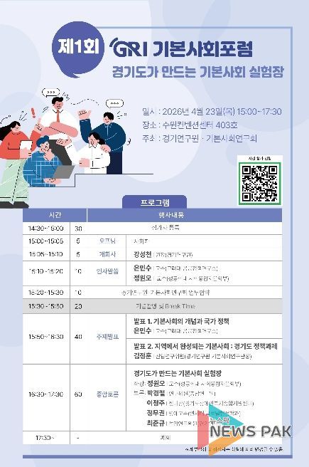 뉴스팍 배상미 기자 | 경기연구원은 오는 23일 오후 3시 수원컨벤션센터 403호에서 ‘경기도가 만드는 기본사회 실험장’을 주제로 ‘제1회 GRI 기본사회포럼’을 개최한다.
