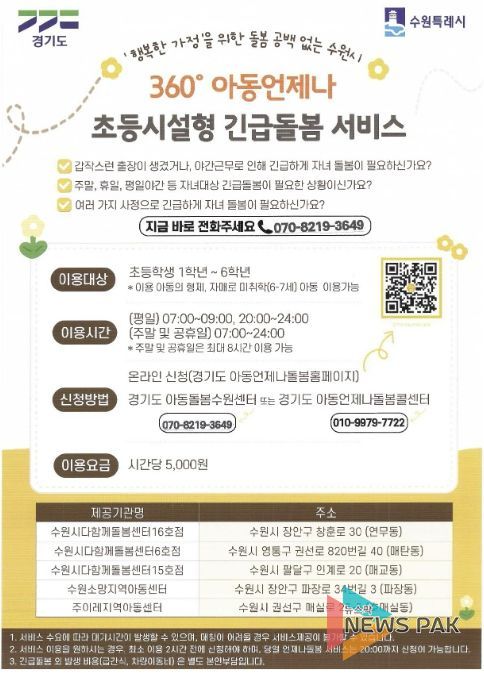 뉴스팍 배상미 기자 | 수원시는 아이 키우기 좋은 도시를 넘어 아동을 함께 키우는 도시다. 저출생 대응을 위해 출산과 양육, 돌봄의 전 과정을 지역사회가 지원하는 것을 목표로 다각적인 정책을 추진하고 있다. 특히 아동을 양육하는 가정이 직면하게 되는 상황마다 맞춤형 서비스와 지원이 촘촘하다. 돌봄이 필요한 순간 이용할 수 있는 수원의 서비스를 안내한다.