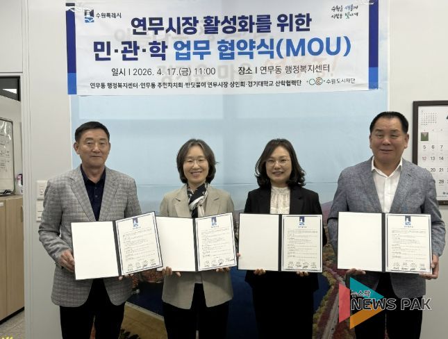 뉴스팍 배상미 기자 | 수원시 장안구 연무동 행정복지센터와 주민자치회, 반딧불이연무시장상인회, 경기대학교 산학협력단은 지난 17일, 각 기관의 긴밀한 상호 협력과 유대관계 강화를 위한 업무협약을 체결했다.
