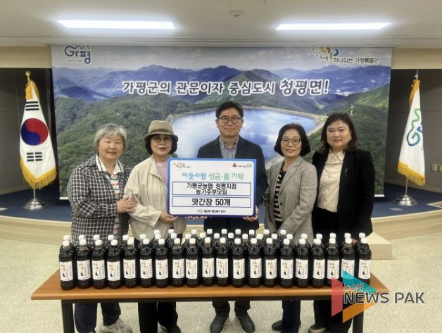 뉴스팍 배상미 기자 | 가평군농협 청평지점 농가주부모임이 20일 지역 내 어려운 이웃을 위해 직접 만든 맛간장 50개를 청평면에 기탁했다.