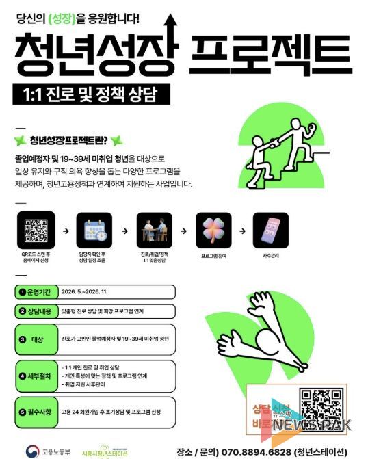 참여 신청은 청년스테이션 현장 또는 ‘고용24’ 누리집 내 청년성장프로젝트 페이지를 통해 가능하다. 프로그램은 5월부터 전문 상담사의 1대1 진단을 바탕으로 개인별 맞춤형 과정으로 운영된다.