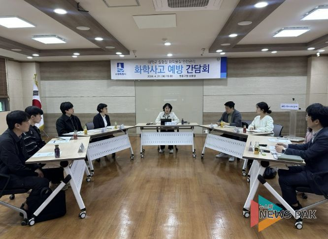 뉴스팍 배상미 기자 | 수원특례시는 21일 영통구청 상황실에서 관내 대학교 안전관리자들과 ‘연구실험실 화학사고 예방 간담회’를 열고, 사고 예방·대응 방안을 논의했다.