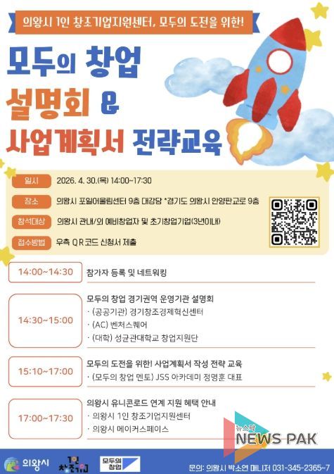 뉴스팍 배상미 기자 | 의왕시 1인 창조기업지원센터는 4월 30일, 창업을 희망하는 예비 및 초기 창업자를 대상으로 ‘모두의 창업’ 설명회 및 전략 교육을 개최한다.