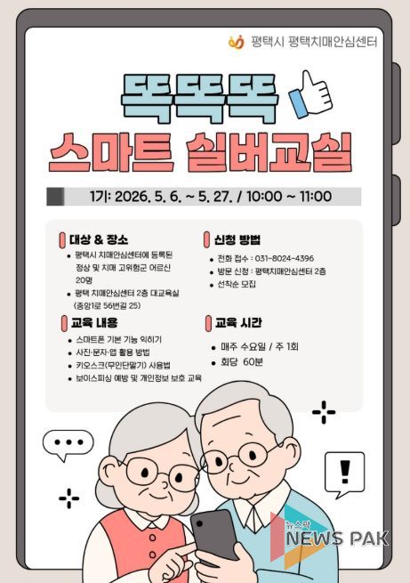 뉴스팍 이소율 기자 | 평택치매안심센터는 오는 5월 6일부터 27일까지 치매 예방 및 인지 기능 강화를 위한 ‘똑똑똑 스마트 실버교실’을 운영한다고 밝혔다.